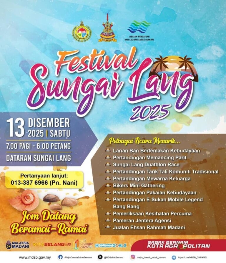 JOM KE FESTIVAL SUNGAI LANG 2025! Tarikh: 13 Disember 2025 (Sabtu) Masa: 7.00 pagi – 6.00 petang Lokasi: Dataran Sungai Lang Pelbagai aktiviti menarik menanti anda! Larian Ban Bertemakan Kebudayaan Pertandingan Memancing Parit Sungai Lang Duathlon Race Tarik Tali Komuniti […]