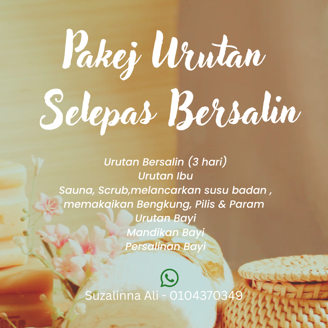Kepada yang ingin mencari perkhidmatan urutan selepas bersalin boleh menghubungi Puan Suzalinna Ali yang akan menyediakan pakej yang berpatutan dan lengkap dengan peralatan seperti mandian dan juga pemakanan selepas bersalin. No. Dihubungi : https://wa.link/qkgr9m