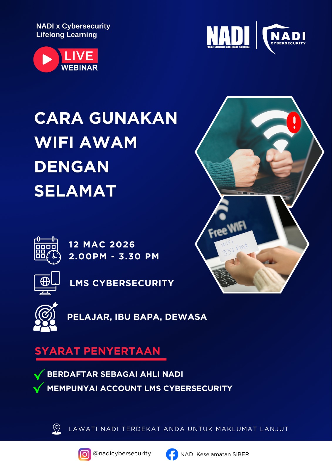 CARA GUNAKAN WIFI AWAM DENGAN SELAMAT Dalam sesi ini, peserta akan didedahkan tentang risiko menggunakan WiFi awam serta langkah-langkah yang boleh diambil untuk melindungi data dan maklumat peribadi ketika menggunakan rangkaian internet di tempat awam. 📅 Tarikh: 12 Mac 2026⏰ […]