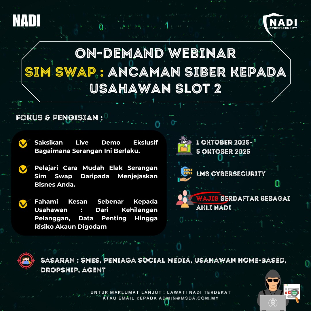 Dimaklumkan bahawa rakaman webinar “Sim swap : Ancaman Siber Kepada Usahawan Slot 2″ yang berlangsung pada 25 September 2025 kini telah dibuka untuk tontonan semula melalui LMS Cybersecurity. 📅 Tempoh Tontonan Rakaman:1 Oktober 2025 hingga 5 Oktober 2025 Rakaman ini […]